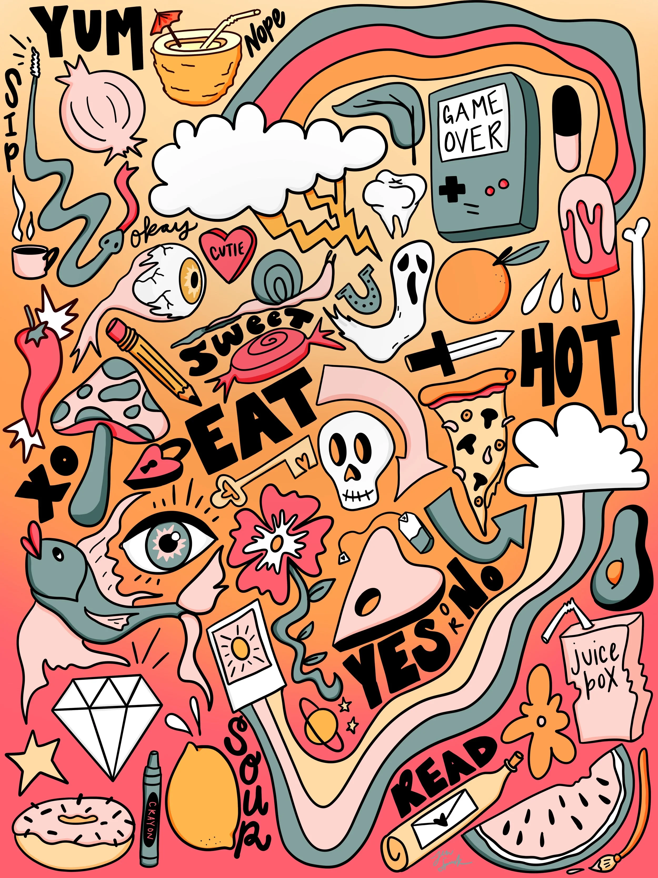 Delve into who she is, her journey, creative process, and what sparks her imagination. Crafting illustrations with whimsical strokes, vibrant palettes and textures, she explores a myriad of mediums but always finds solace in watercolors, pen work, or digital art.